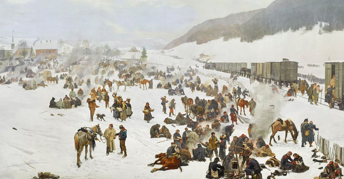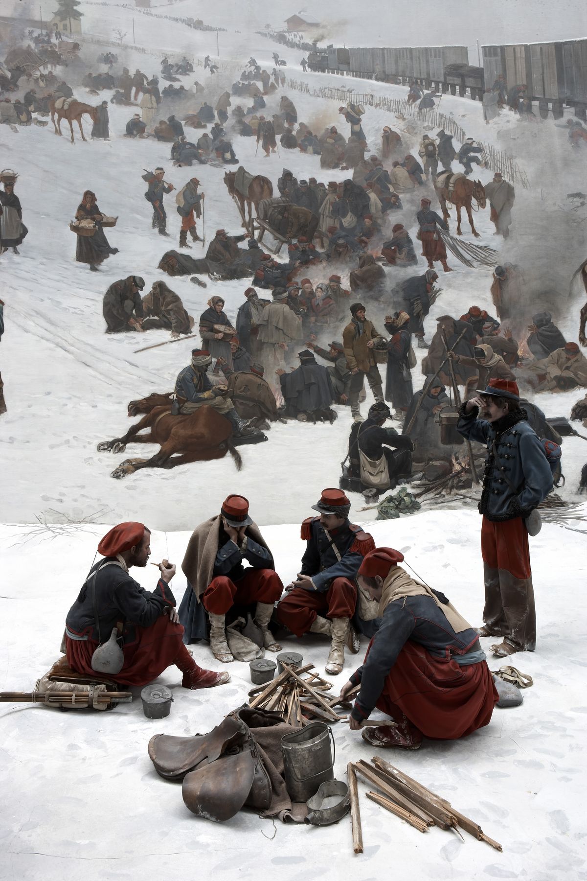 La Guerre franco-allemande (1870/1871) se solde par la défaite de la France. Après la capture de Napoléon III à l’automne 1870, la proclamation de la Troisième République en France et la proclamation de l’Empire allemand, l’Armée de l’Est française, conduite par le Général Bourbaki, se déploie en janvier 1871 pour mener une dernière bataille perdue d’avance. Les soldats sont encerclés dans le Jura français par les troupes allemandes. Une convention signée le 1er février définit les conditions de la plus grande action d’accueil de réfugiés jamais accomplie en Suisse : l’internement de l’Armée de l’Est. En trois jours, quelque 87000 soldats franchissent la frontière suisse. Sur son panorama, Castres illustre l’internement dont il fut témoin aux Verrières dans le Val-de-Travers. Les soldats français sont désarmés par les militaires suisses, secourus par les civils et pris médicalement en charge par la Croix-Rouge. Ils sont ensuite hébergés dans 188 communes suisses. Les « Bourbakis » quitteront la Suisse neutre en mars 1871 après l’armistice pour regagner leur pays. La population civile, l’État et les œuvres de secours s’emploient à accomplir cette immense mission d’accueil avec une solidarité toute naturelle qui cimente aujourd’hui encore la tradition humanitaire et la neutralité de la Suisse.