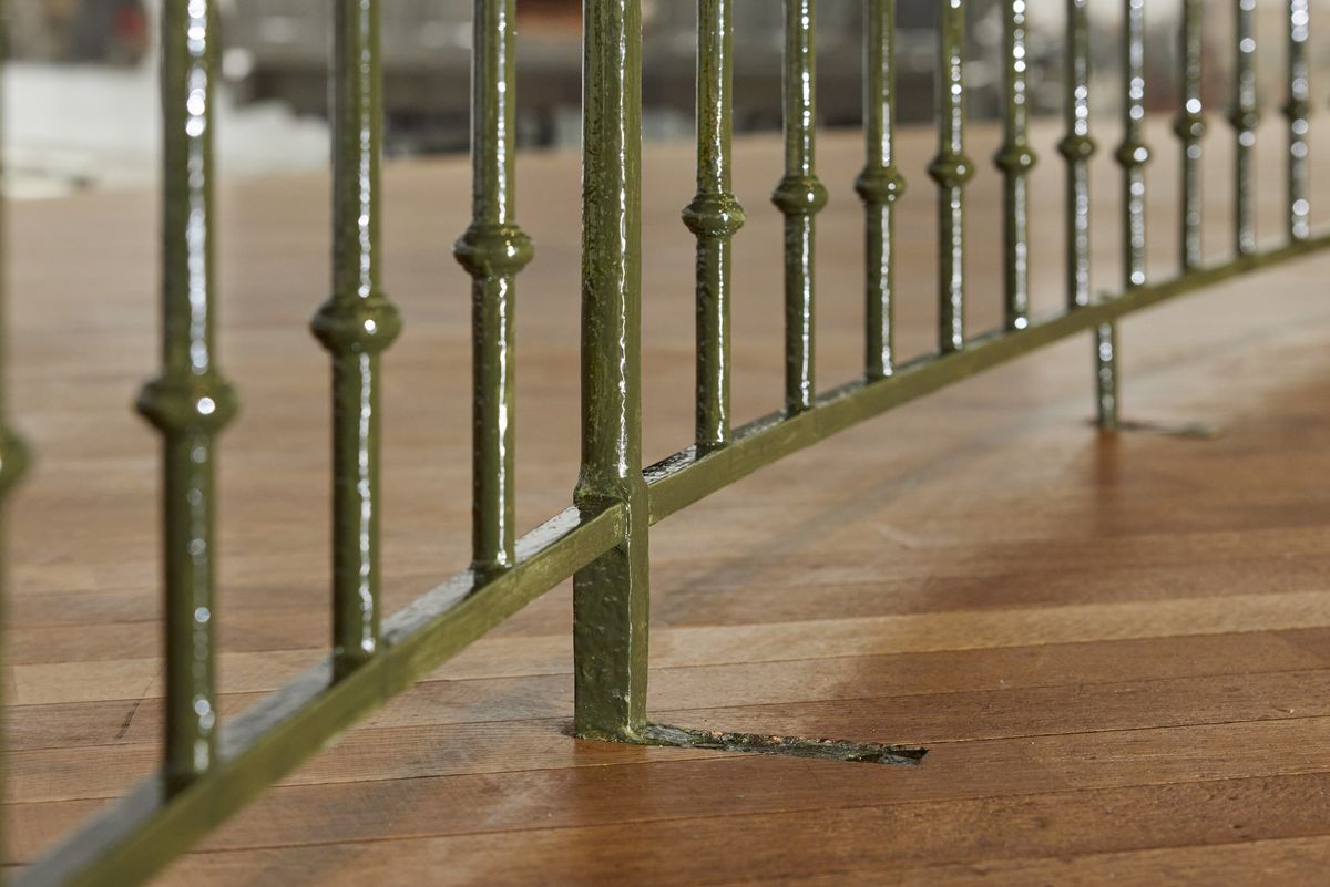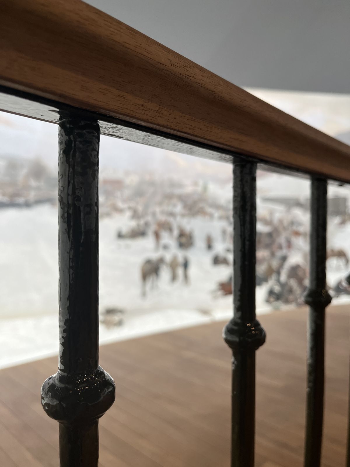Sowohl die lederbezogenen Sitzbänke wie auch das verzierte und bemalte Metallgeländer auf der Aussichtsplattform stammen von 1889, dem Erbauungsjahr des Panoramas. Die Originalstücke stehen heute unter Denkmalschutz. Die tägliche Nutzung seit der Wiedereröffnung des Museums vor fast 30 Jahren hat Spuren der Abnutzung hinterlassen. So bilden sie einen teilweise drastischen Kontrast zur hohen Qualität des Kunstwerks.