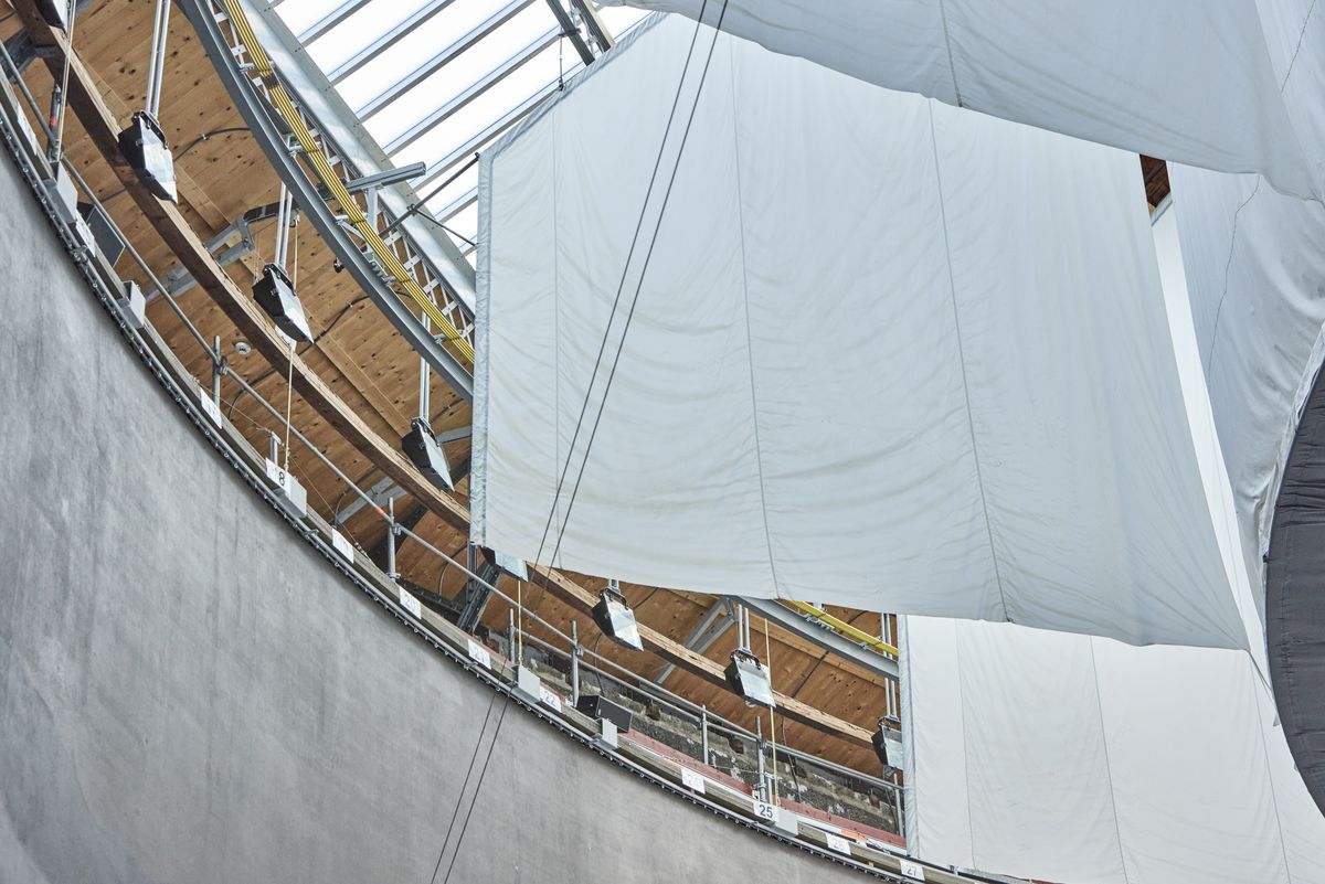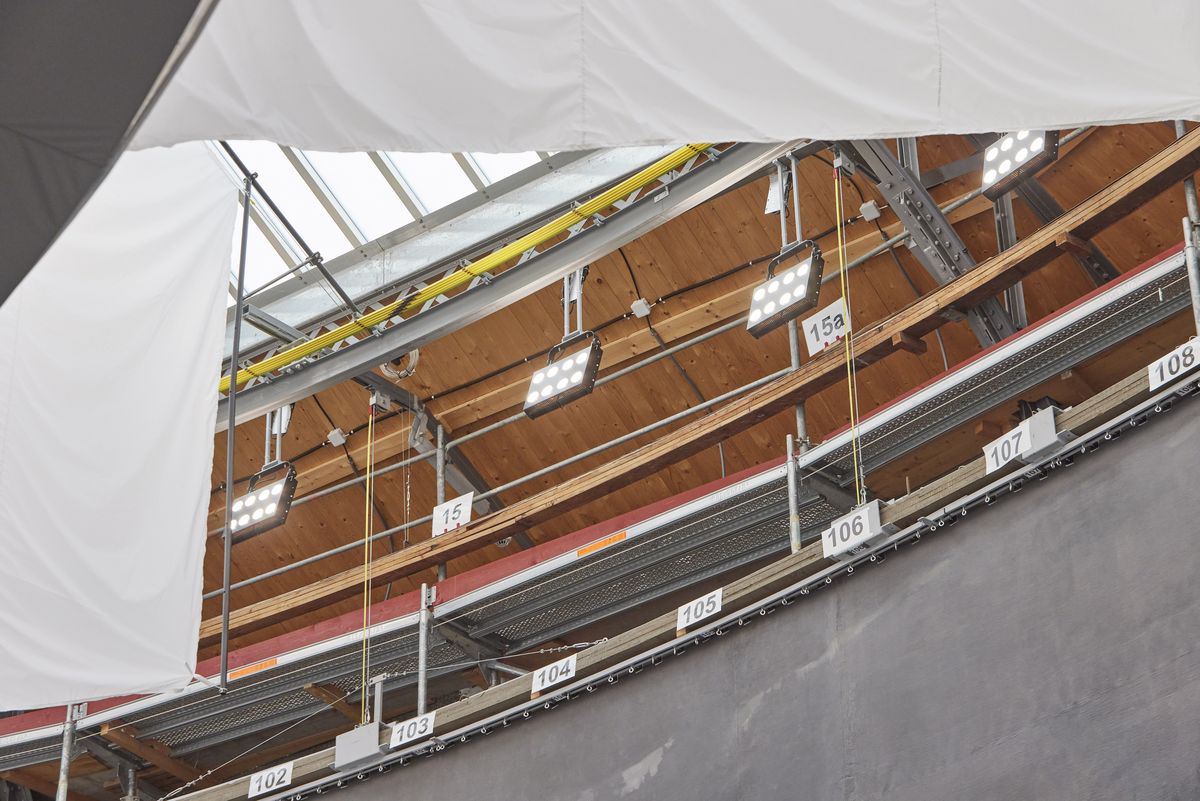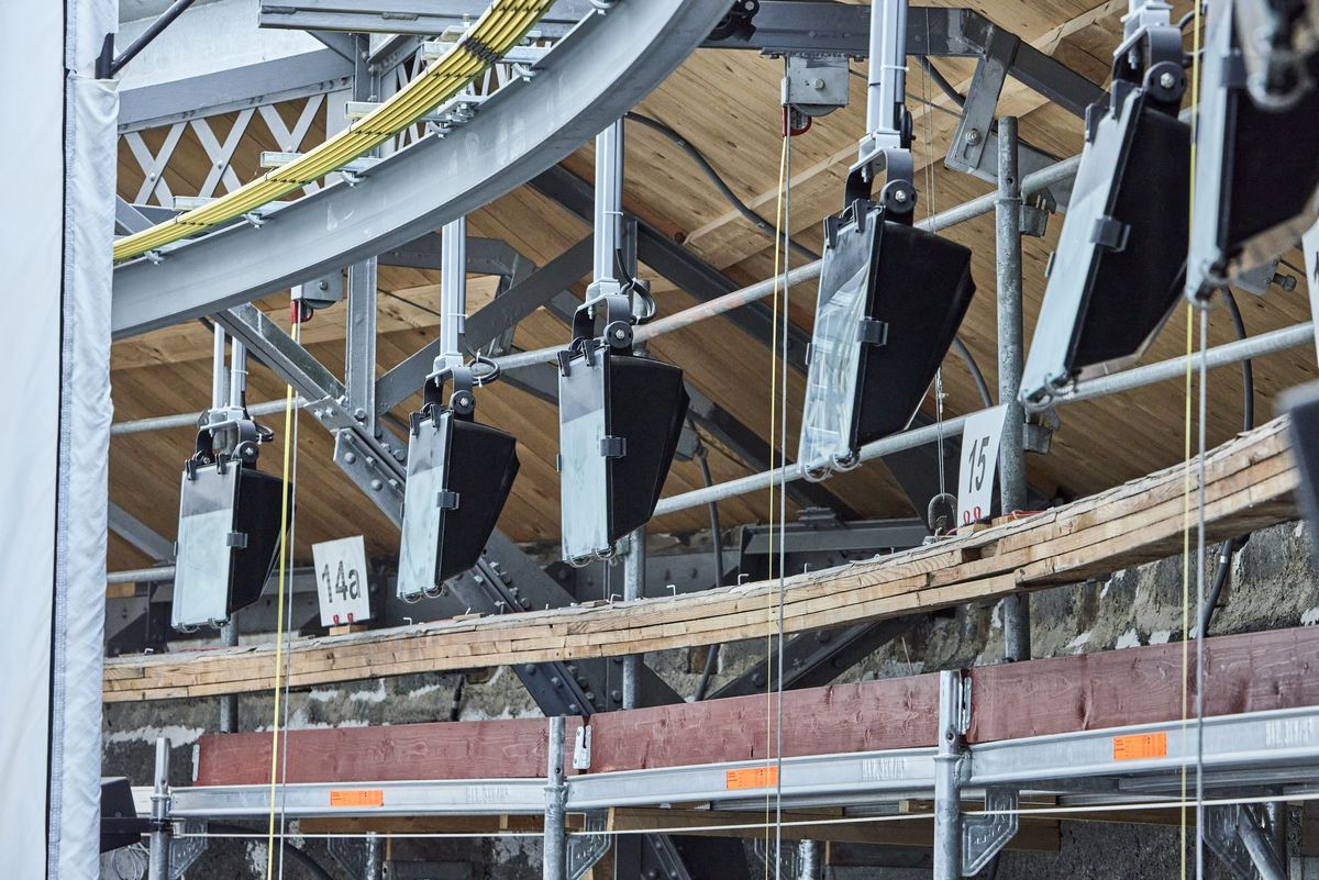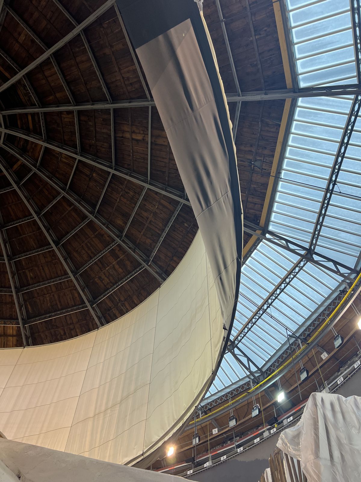 Der Ersatz des Baldachins ist das umfangreichste Teilprojekt der aktuellen Sanierung. Insgesamt werden rund 1600 Quadratmeter Stoff mit einem Gesamtgewicht von 200 Kilogramm ausgewechselt.