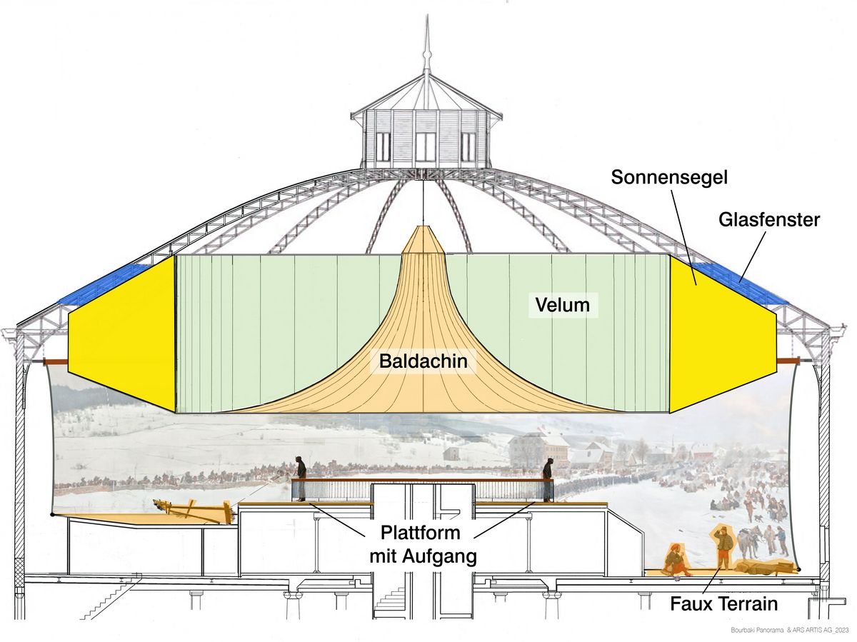 Das Panorama lebt vom Licht: Neben dem Einfallswinkel des Tageslichts durch das Dach und der spezifischen Reflexionsarchitektur (siehe Optischer Apparat) gewährleistet im Bourbaki Panorama auch ein Kunstlichtsystem die konstante Brillanz des lichtempfindlichen Ölgemäldes.