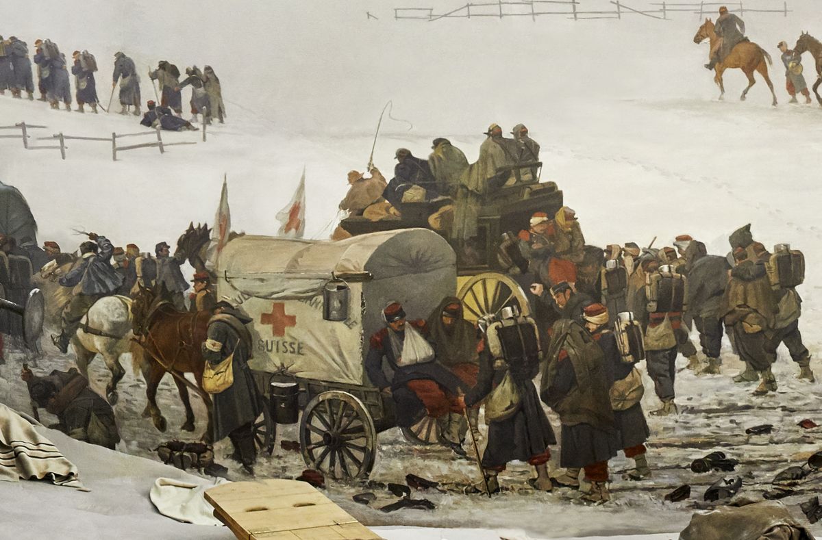 Der signifikante Einsatz der Roten Kreuzes bei der Internierung der Bourbaki-Armee 1871 verhalf der jungen Hilfsorganisation zu deren Profilierung. Im Bild von Edouard Castres, selbst Rotkreuzhelfer und Augenzeuge der Internierung, nimmt sie denn auch eine prominente Stellung ein. Welche Werte waren für Edouard Castres insbesondere zentral und in welchen Details wird die Botschaft von Henry Dunant und dem Roten Kreuzes im immensen Kunstwerk eminent? Wandern Sie mit uns entlang von Werten, Wünschen und Wundern im riesigen Rundbild.