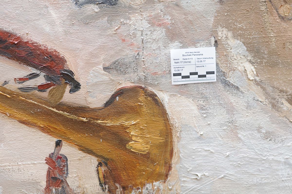 Haben Sie sich auch schon gefragt, wie das Bourbaki Panorama hinter der Leinwand aussieht? Wie und womit ist das Bild fixiert? Wie werden Reparaturen vorgenommen? Wie sieht die Malschicht von nahe aus? Und welche Rolle spielt wohl das Wetter? Gerade die Auswirkungen von Klimaschwankungen auf das Rundbild aus dem Jahr 1881 sind beachtlich: Malgewebe und Malschicht reagieren ganz unterschiedlich auf das Klima, die Leinwand bewegt sich dabei wie eine Lunge beim Ein- und Ausatmen. Diese klimatischen Beeinflussungen wurden 2018 in einem umfassenden Restaurierungsprojekt genau untersucht und finden seither Beachtung bei restauratorischen Tätigkeiten.